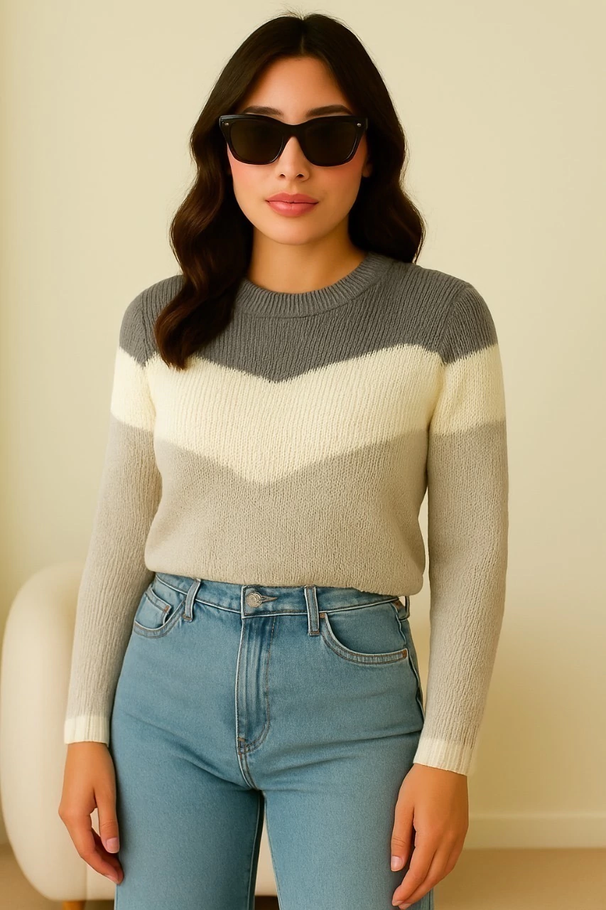 Sweater suave y cómodo, perfecto para acompañarte en los días frescos. Su diseño tricolor le aporta un toque original y moderno, elevando cualquier outfit con muy poco esfuerzo.